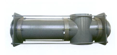 性能特點:該膨脹節的前部(輸流端)有兩個工作波紋管,后部(盲端)有一個平衡波紋管構成。工作波紋管吸收來自彎管段產生的橫向位移;平衡波紋管吸收來自直管段的軸向位移。